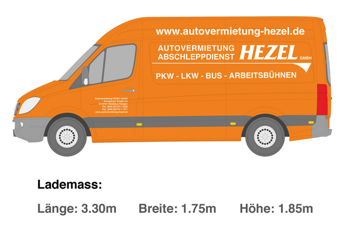 | Lademass: | Länge 3.30m / Breite 1.75m / Höhe 1.85m |